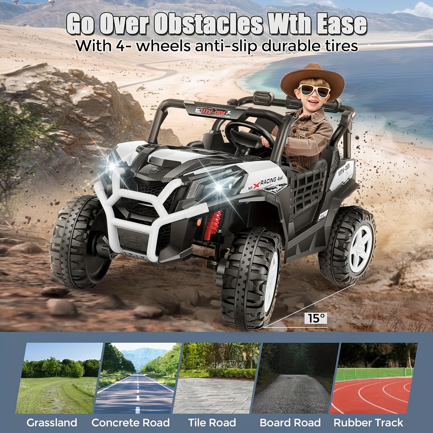 Multi-Functional Dashboard: Features include a one-touch start/stop button with driving sounds, a drive/reverse gear, and a 2WD/4WD For Switch. Also equipped with colorful LED headlights and taillights for nighttime adventures, a horn, fun music, and Wireless connectivity for extra entertainment.