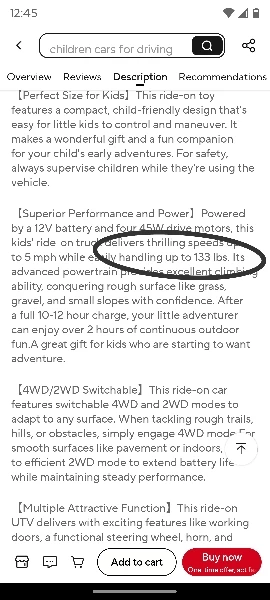 • 【Superior Performance and Power】Powered by a 12V battery and four 45W drive motors, this kids' ride-on truck delivers thrilling speeds up to 5 mph while easily handling up to 133 lbs. Its advanced powertrain provides excellent climbing ability, conquering rough surface like grass, gravel, and small slopes with confidence. After a full 10-12 hour charge, your little adventurer can enjoy over 2 hours of continuous outdoor fun.A great gift for kids who are starting to want adventure.